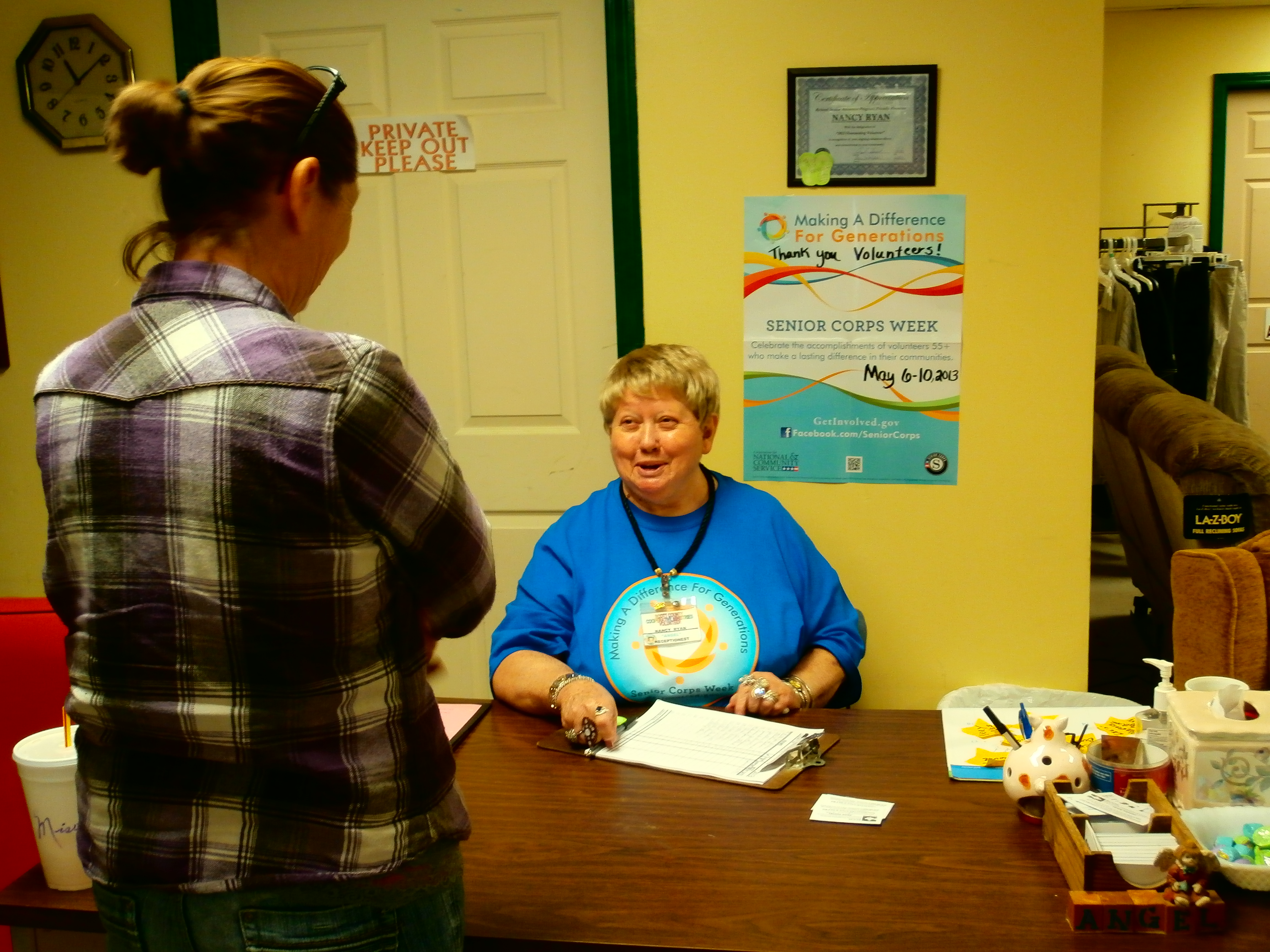 Nancy "Angel" Ryans, RSVP volunteer, always greets food pantry recipients with a smile. She is a true Angel on Earth!