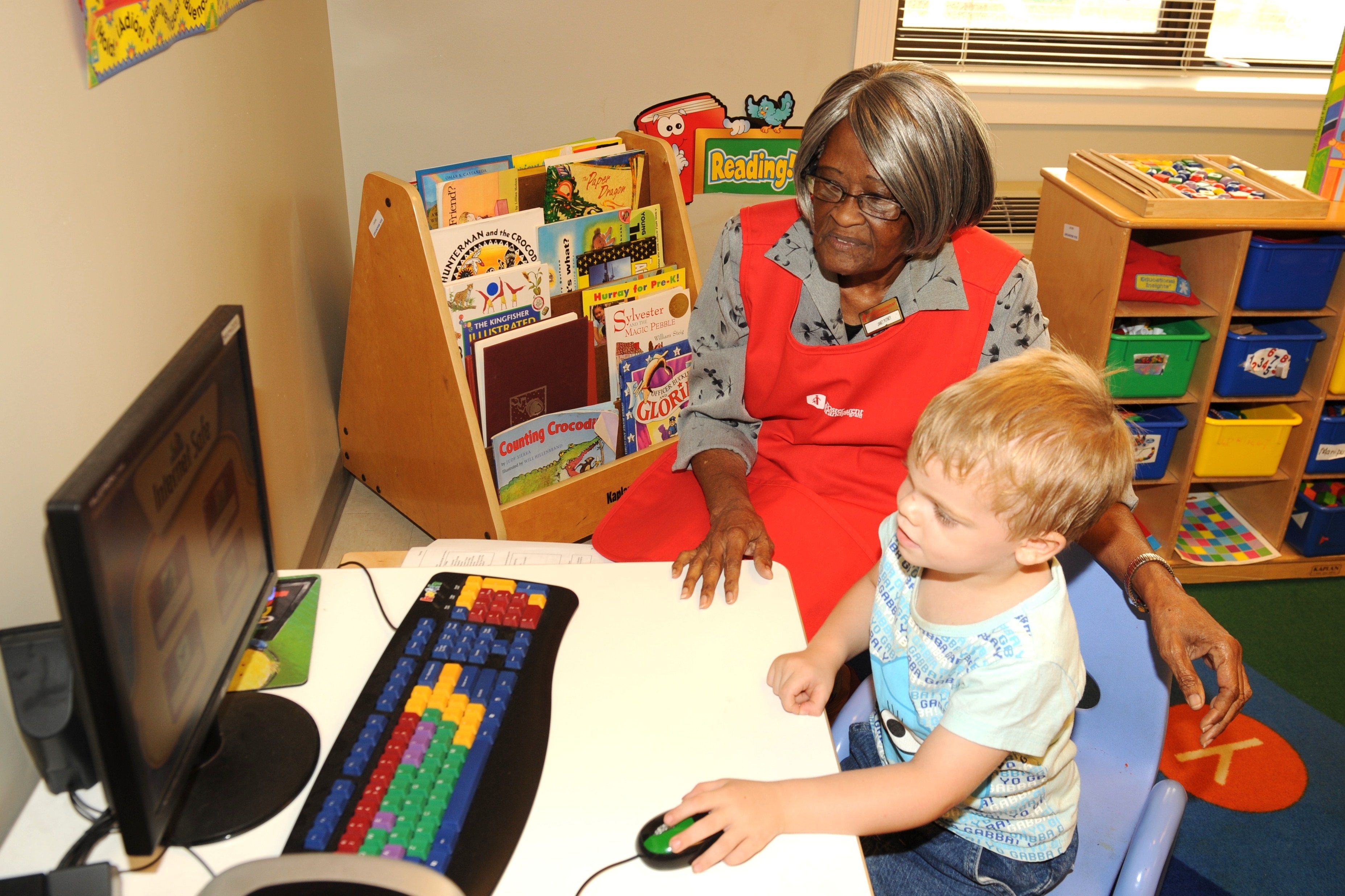 Foster Grandparents in Savannah, GA using the computer to help youth learn to retrieve information, express ideas and communicate with others.