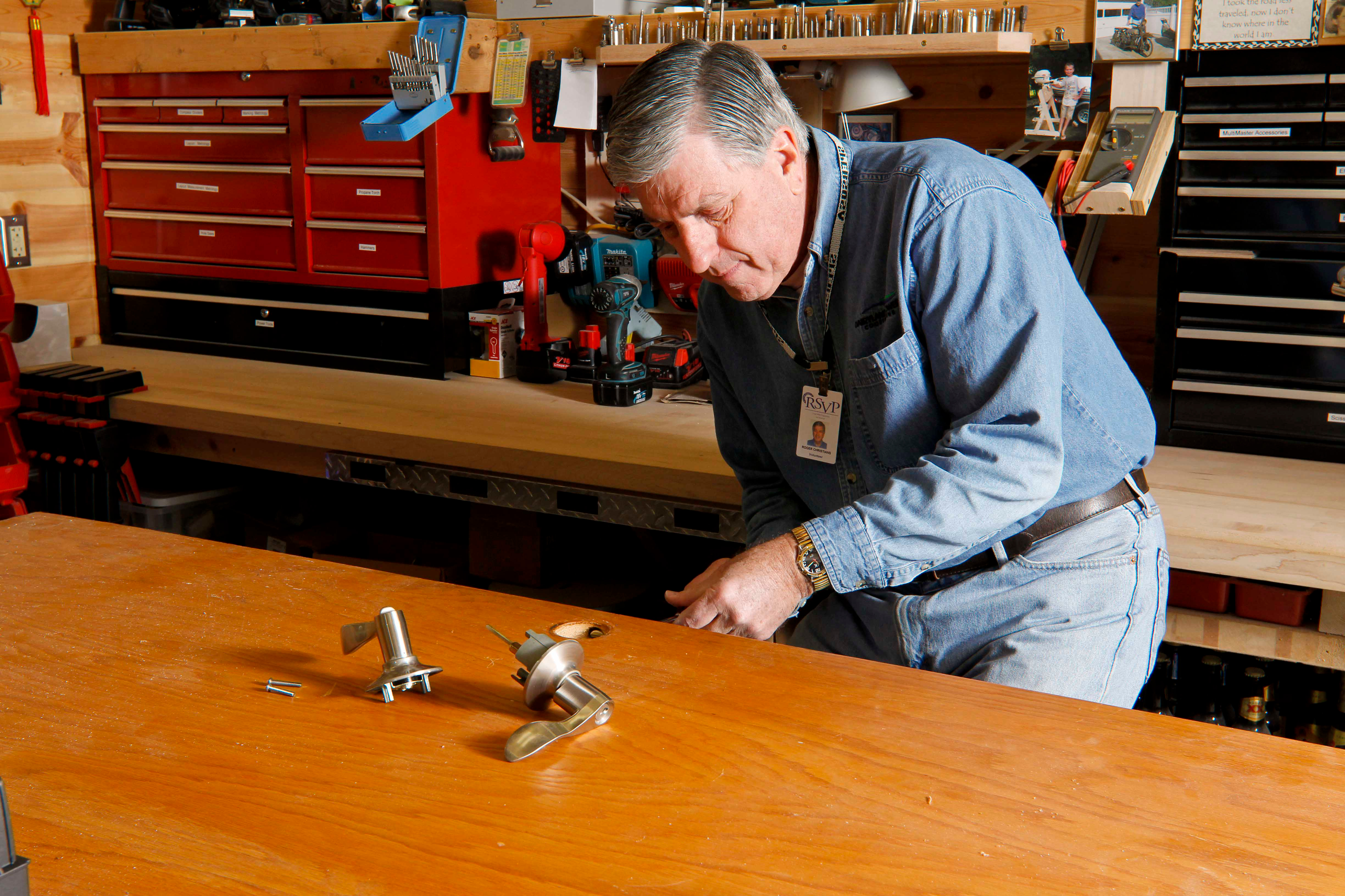 Roger, a Coulee Region RSVP Handyman, installs a deadbolt on an entry door for a low-income, elderly recipient.