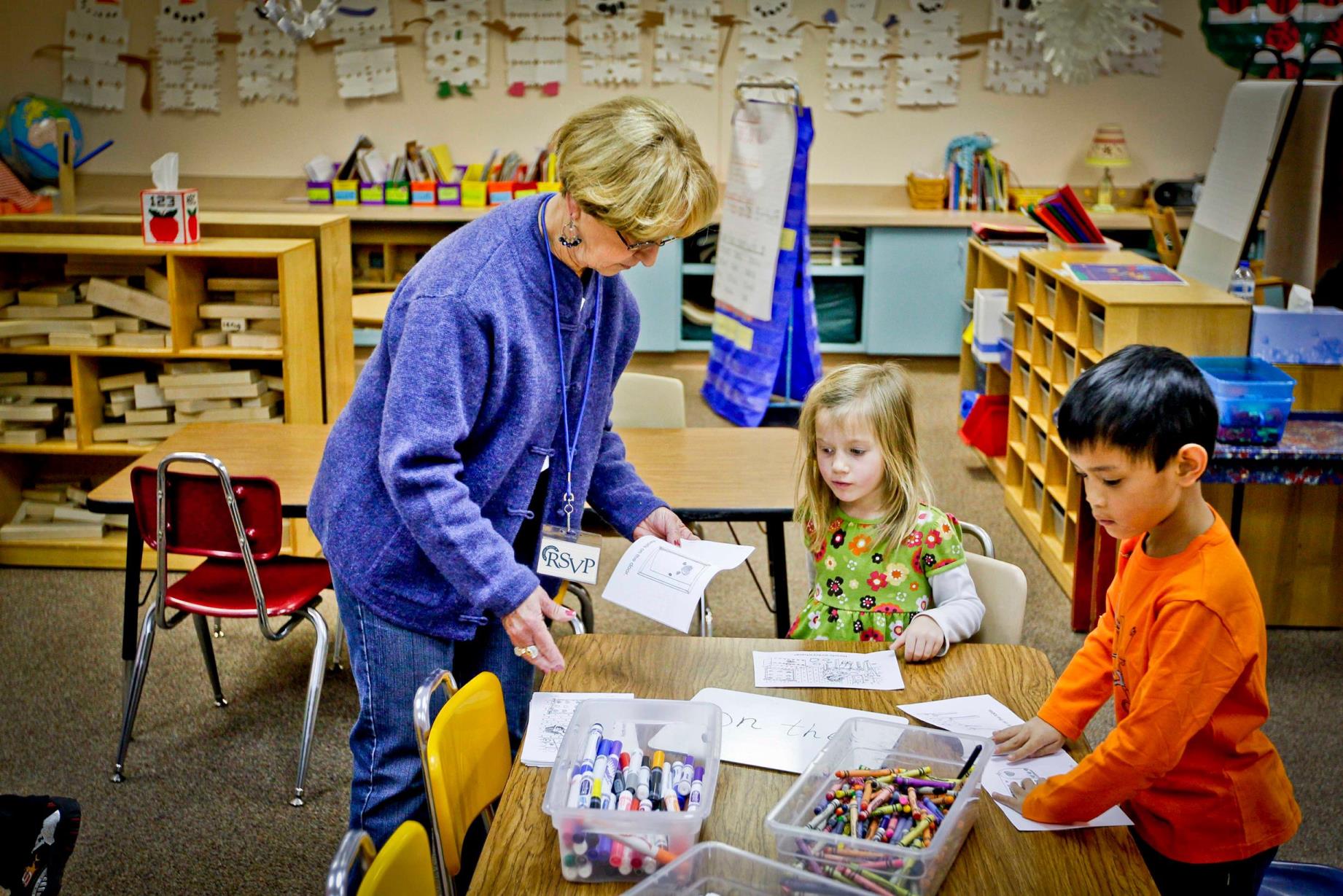 Coulee Region RSVP Study Buddy Volunteer Mary O'Mara works on literacy skills with two students at Southern Bluffs School.
