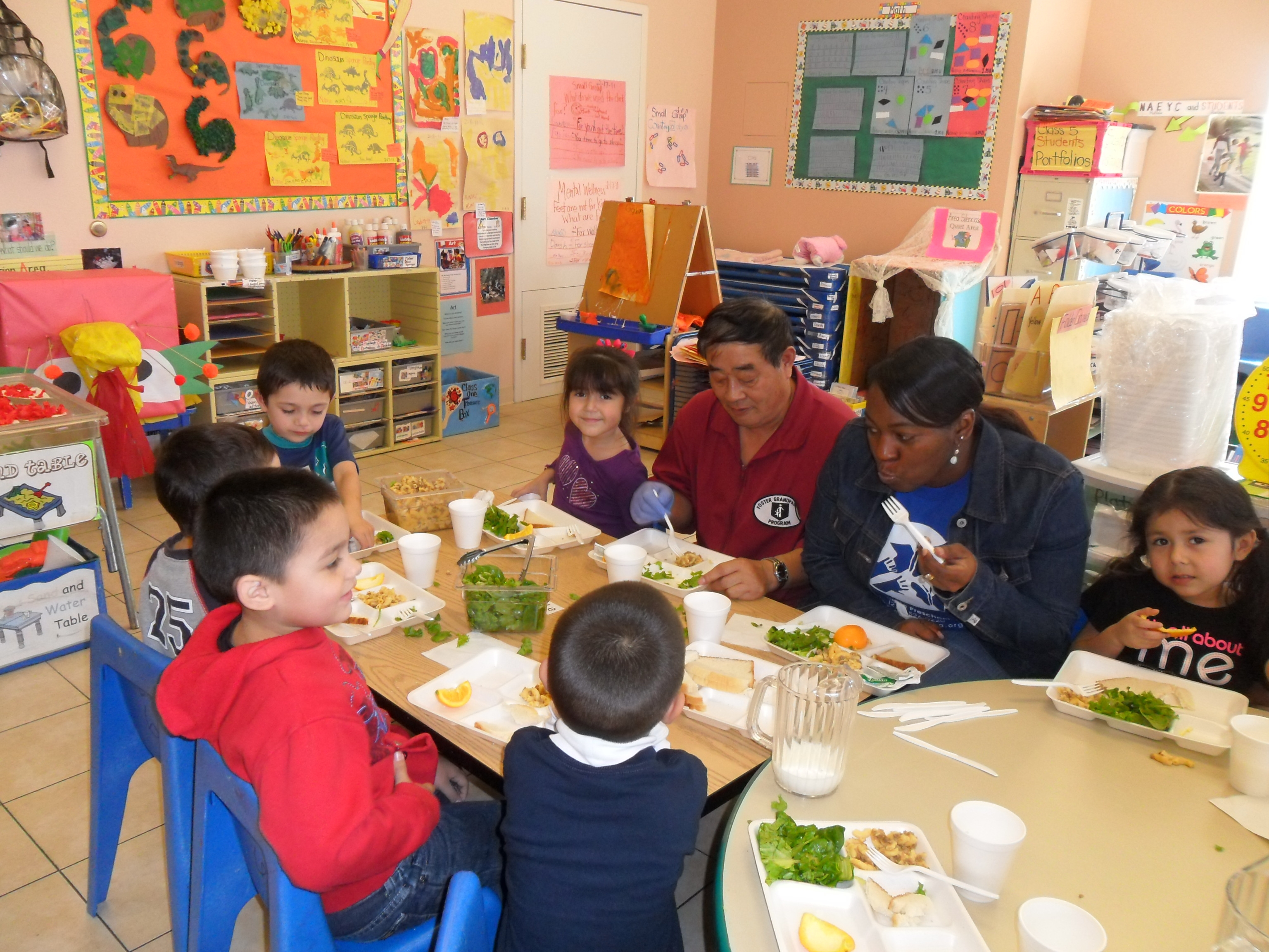 Grandpa, teacher and children enjoying a healthy lunch